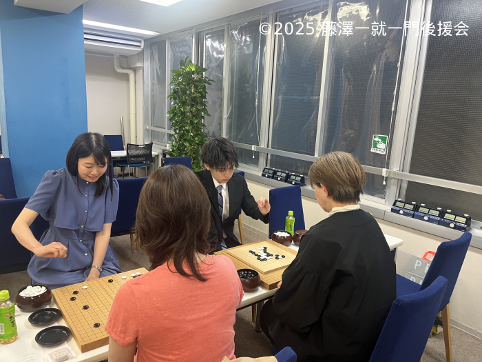 講師:藤澤一就八段、飛田早紀二段、荒井幹太初段、Mさん(教室OB)