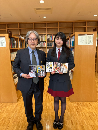 藤澤ななみ初段が母校青山学院中等部長上野亮先生を表敬訪問し、ヒカルの碁コミック全巻・入門ガイドを寄贈いたしました。中等部メディアセンターに、卒業生一言メッセージを添えて置いていただきます。