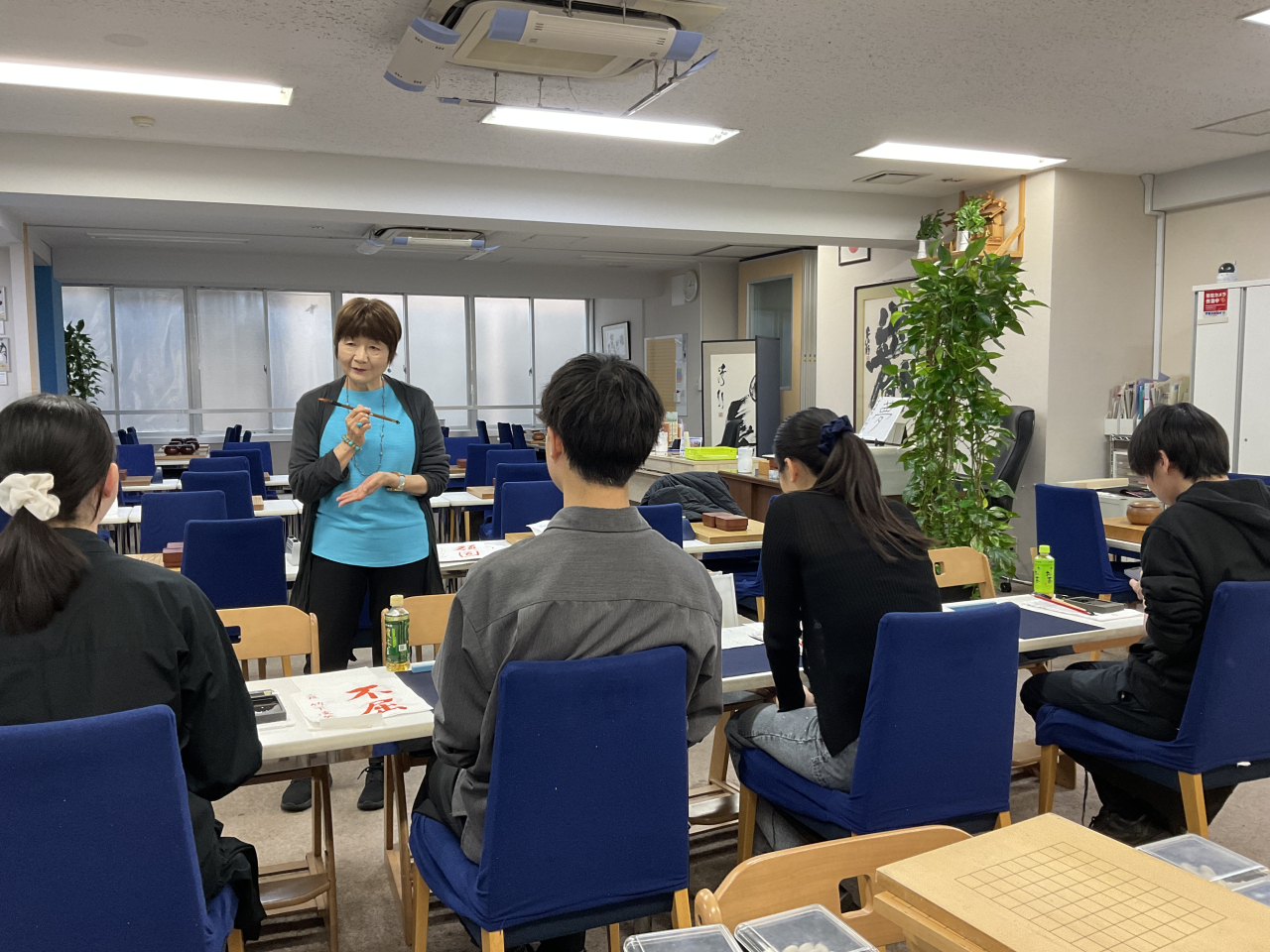 世界で活躍する人材を育成するために実社会で生きる力を醸成する、一門棋士を対象とした教養講座。後援会会員、吉田眞佐子先生による書道の会の第13回目です。